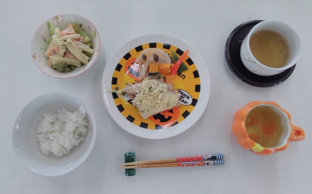 ごはん・豚肉のチーズ焼き・マカロニサラダ・サフランスープです。