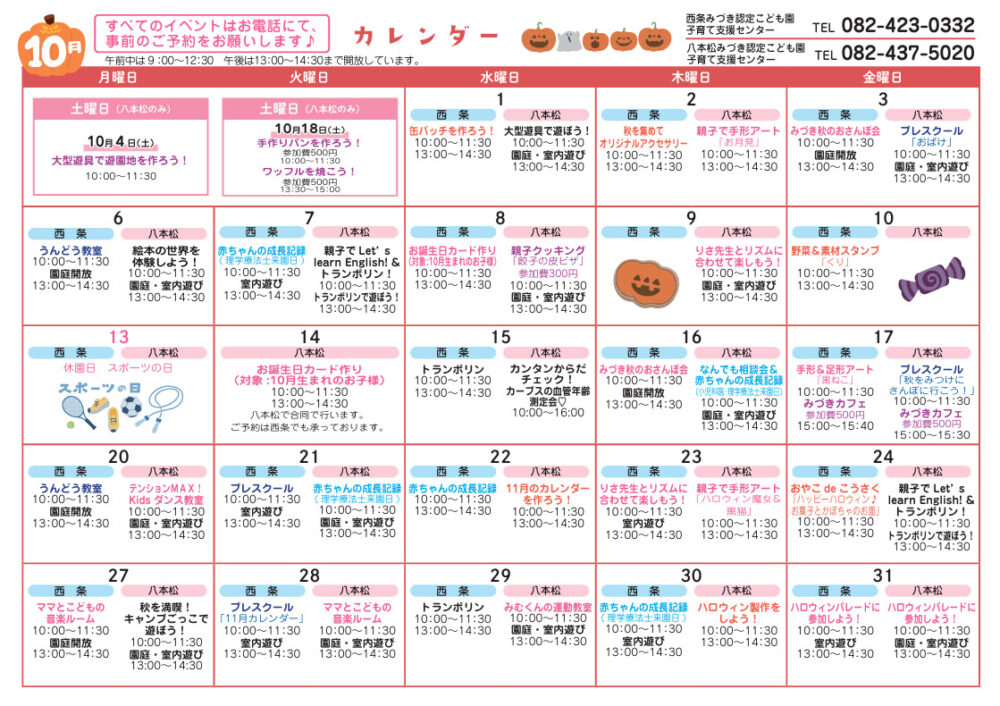 すべてのイベントが予約制となります。ご予約は、それぞれの園にお電話にてお願い致します。