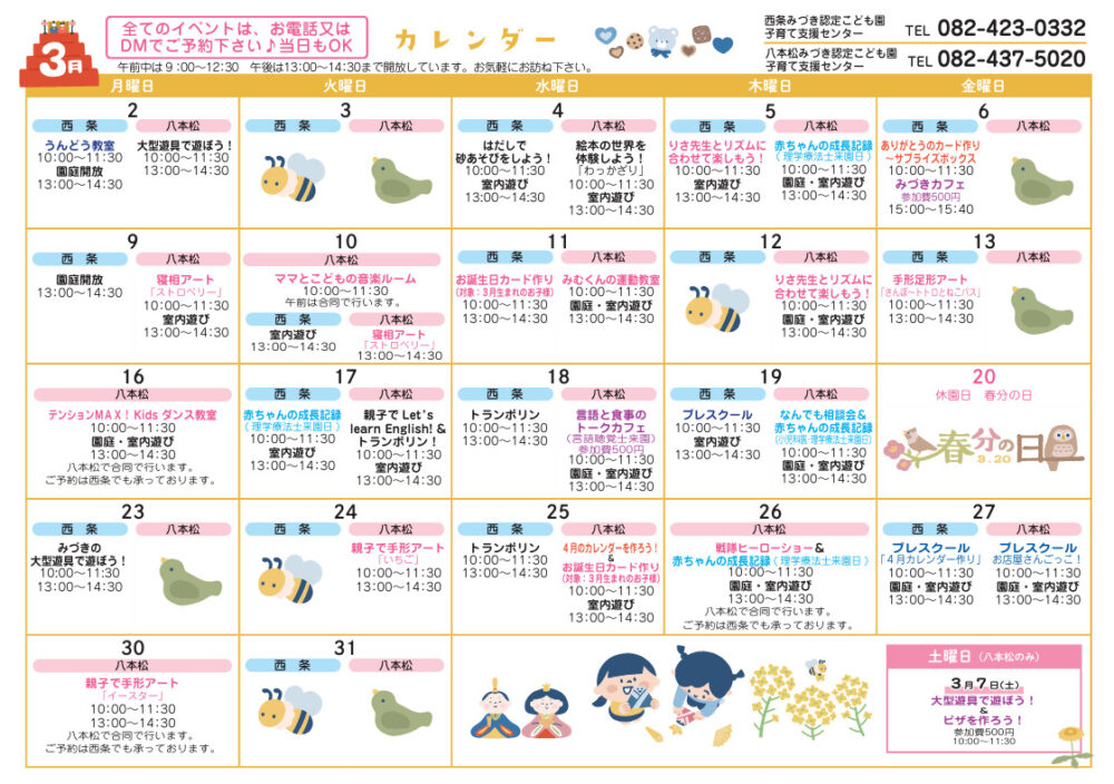 すべてのイベントが予約制となります。ご予約は、それぞれの園にお電話かインスタグラムでも受け付けております。