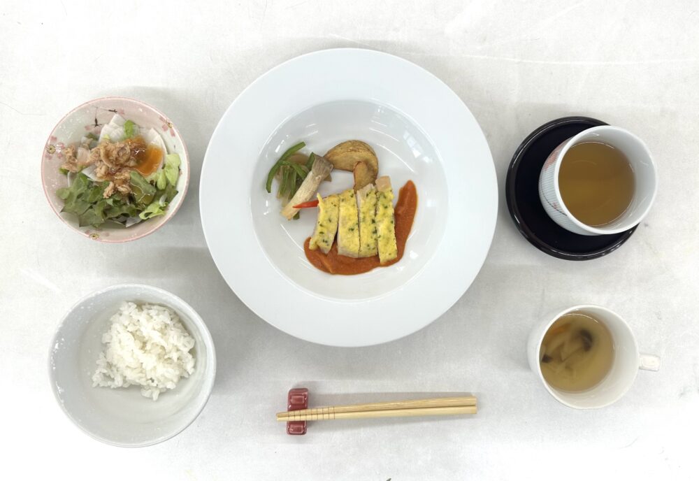 ごはん・豚肉のピカタ・ツナサラダ・きのこスープ