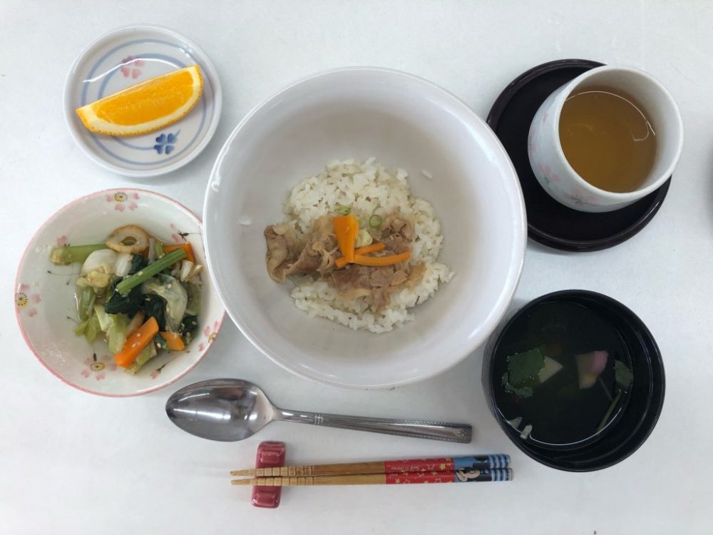 牛丼・青菜のごま和え・すまし汁・フルーツです。