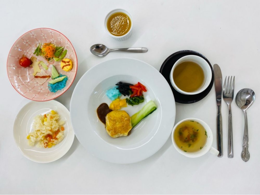 8月6日給食 8月のお誕生日会でした。お誕生日会のテーマが『Tokyo2020頑張れ!Nippon!』だったので、前菜には、オリンピック競技をイメージしました。メインには、五輪マークと金メダルをイメージしたハンバーグにしました。