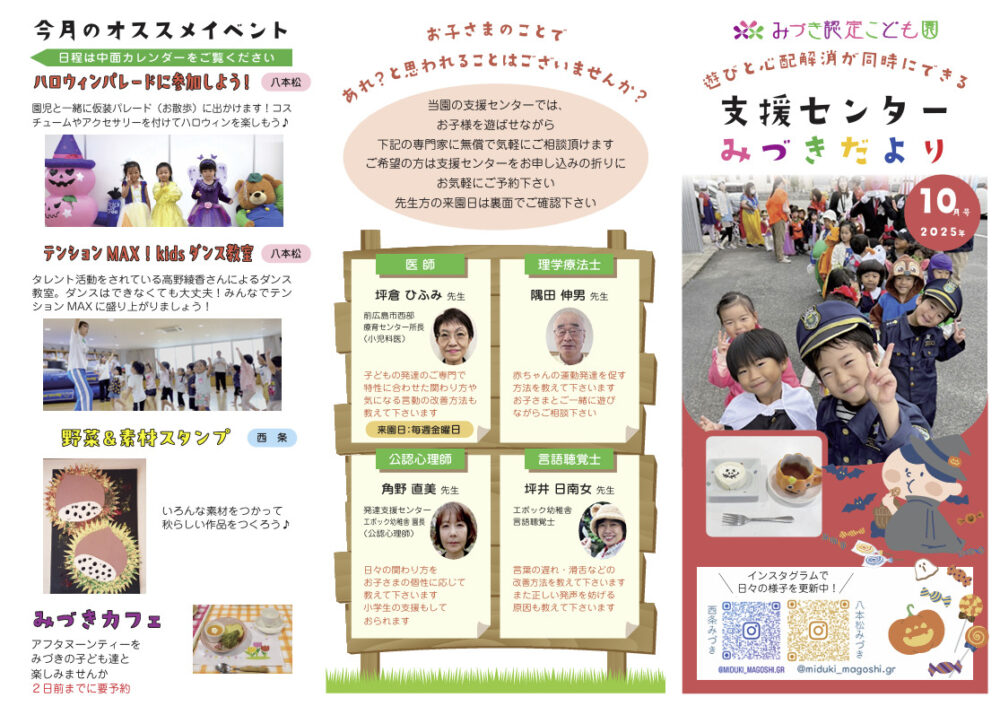 2025年10月子育て支援センターだより 西条みづき認定こども園子育て支援センターよりお知らせがあります。 2025年10月の支援センターだよりが完成しました! ご予約・お問い合わせについては、お電話にてお願い致します。 参加人数の多いイベントに関しましては、人数・時間を分けて受付させていただくことがあります。ご了承の程よろしくお願い致します。 ご参加の際は、手指のアルコール消毒と検温をお願い致します。37.5℃以上の方は、ご参加いただけません。 ご参加お待ちしております♪